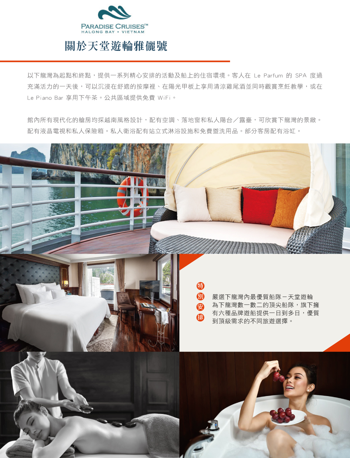 ※為讓貴賓都能得到最佳服務品質,遊船行程安排及餐食菜色內容,以天堂號船公司現場公告為主。