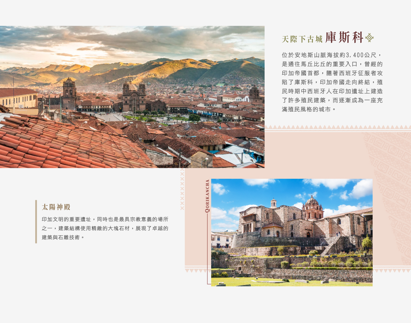 ■庫斯科,位於安地斯山脈海拔約3,400公尺,是通往馬丘比丘的重要入口,曾經的印加帝國首都,隨著西班牙征服者攻陷了庫斯科,印加帝國走向終結,殖民時期中西班牙人在印加遺址上建造了許多殖民建築,而逐漸成為一座充滿殖民風格的城市,武器廣場是這座城市的核心地帶,現在更是旅人探索庫斯科的起點,廣場四周環繞著壯麗的殖民時期建築、教堂與露天咖啡座,在歷史與現代交織的氛圍中感受庫斯科的獨特魅力;★太陽神殿是印加文明的重要遺址,同時也是最具宗教意義的場所之一,這座神殿專門供奉太陽神Inti,印加人相信太陽神是他們的守護神,建築結構使用精緻的大塊石材,展現了卓越的建築與石雕技術。