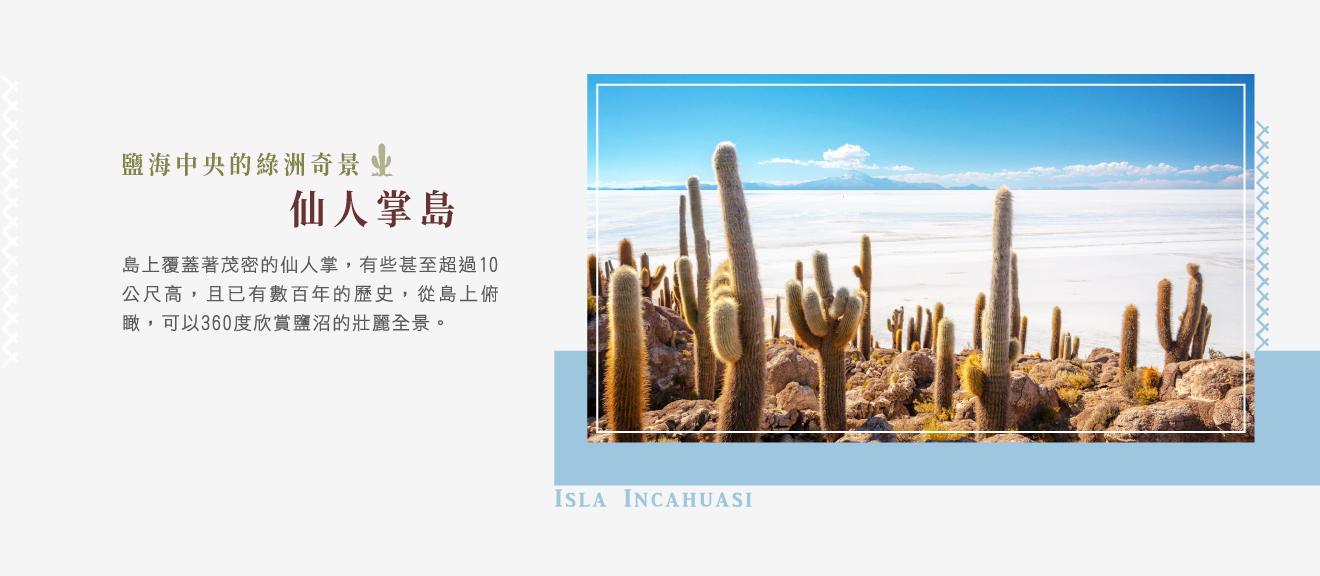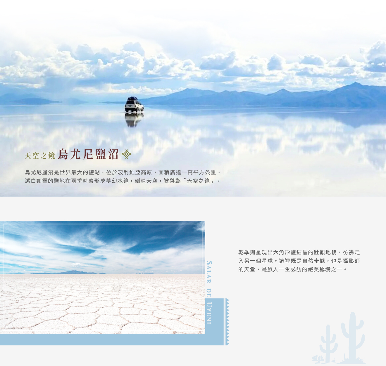 ■烏尤尼鹽沼,它是世界上最大的鹽沼,數萬年前這片區域曾是一個名為明欽湖的史前湖泊。隨著氣候變遷和湖水的蒸發,湖泊乾涸後留下了巨大的鹽層。乾季時,鹽沼表面乾燥龜裂,形成大片白色的六邊形鹽塊,猶如一片無邊無際的白色荒原;而雨季期間,鹽沼表面覆蓋上一層薄薄的水,成為天然的天空之鏡。■仙人掌島,島上覆蓋著茂密的仙人掌,有些甚至超過10公尺高,且已有數百年的歷史,從島上俯瞰,可以360度欣賞鹽沼的壯麗全景。
