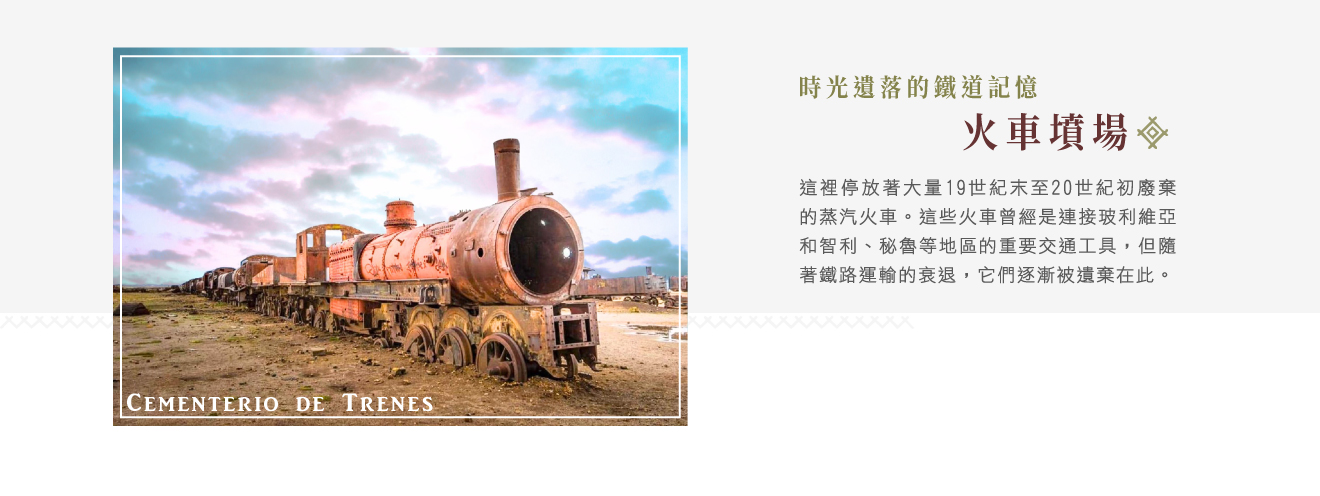 從拉巴斯的機場辦理登機前往烏尤尼,準備一探天空之鏡。抵達烏尤尼後,拜訪■火車墳場,這裡停放著大量19世紀末至20世紀初廢棄的蒸汽火車。這些火車曾經是連接玻利維亞和智利、秘魯等地區的重要交通工具,但隨著鐵路運輸的衰退,它們逐漸被遺棄在此。隨後驅車前往■科爾查尼參觀製鹽工廠及紀念品市集,結束參觀後乘車駛入烏尤尼鹽沼。