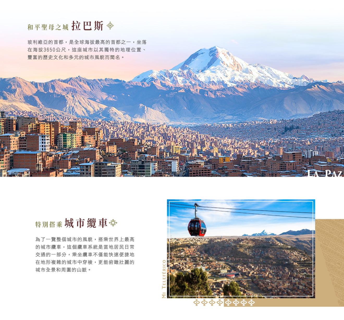 搭乘飛機前往玻利維亞的首都■拉巴斯,它是全球海拔最高的首都之一,坐落在海拔3650公尺。這座城市以其獨特的地理位置、豐富的歷史文化和多元的城市風貌而聞名。為了一覽整個城市的風貌,特別安排★搭乘世界上最高的城市纜車系統「Mi Teleférico」,這個纜車系統是當地居民日常交通的一部分,連接著拉巴斯市中心與鄰近的城市埃爾阿爾托,乘坐纜車不僅能快速便捷地在地形複雜的城市中穿梭,更能俯瞰壯麗的城市全景和周圍的山脈。