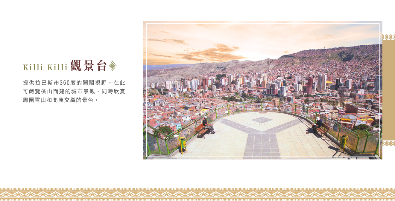 ■女巫市場參訪,這裡充滿了富有安地斯傳統文化的商品,從草藥到護身符一應俱全,一窺帕查瑪瑪(Pachamama)的傳統信仰。■Killi Killi觀景台提供拉巴斯市360度的開闊視野,在此可飽覽依山而建的城市景觀,同時欣賞周圍雪山和高原交織的景色。