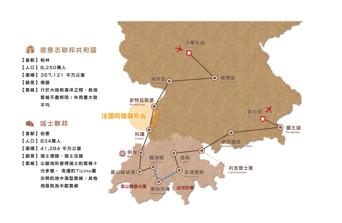 創意德國瑞士~阿爾薩斯巴登巴登溫泉鄉冰河列車新天鵝堡國王湖雙峰驚豔12天