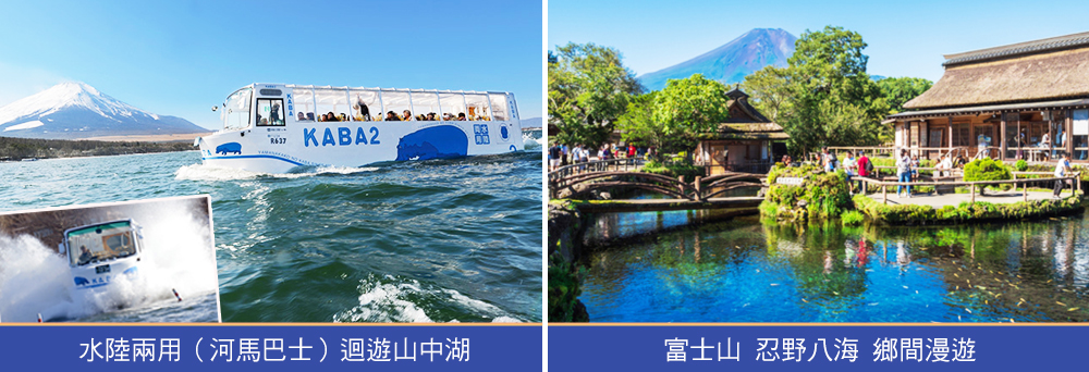 搭乘水陸兩用KABA BUS(河馬巴士),在路上走約10分鐘,再衝入山中湖濺起巨大的水花,令人難忘的體驗。在湖中迴遊,約20分鐘觀賞富士山與山中湖構成的如畫的湖山美景。