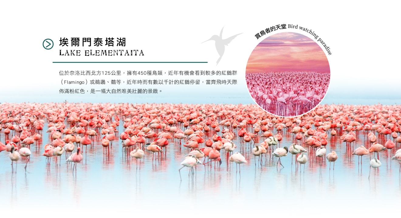 抵達奈洛比辦理入境手續後,前往★埃爾門泰塔湖Lake Elementaita,被聯合國教科文組織列為世界自然遺產地,是一片遺世獨立的鹹水湖秘境。位於奈洛比西北方125公里,擁有400多種鳥類,近年有機會看到較多的紅鶴群(Flamingo)或鵜鶘、鷸等,近年時而有數以千計的紅鶴停留,如遇天氣良好和湖水位適宜,將有機會觀賞成群紅鶴齊聚一堂的壯麗景致,當齊飛時天際佈滿粉紅色,是一幅大自然唯美壯麗的景緻。接著前往魚鷹的故鄉─★奈瓦夏湖Lake Naivasha,這個東非大地塹內唯一的淡水湖,四周圍繞著壯闊的山色,湖岸群聚著許多不同種類的水鳥,湖內更有不時抬頭探看的河馬家族,讓這個大自然景致更加生動有趣,今晚夜宿奈瓦夏湖區。
