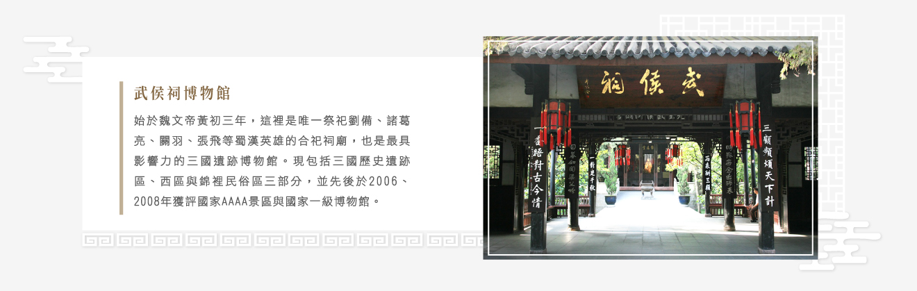 【武侯祠錦里古街】街道全長550公尺,建築以清末民初四川民居風格為基礎,內容以三國文化和四川傳統民俗文化為內涵,2004年10月正式對外開放,“拜武侯、泡錦里”已成為成都旅遊號召力的響亮口號之一;2005年被評選為“全國十大城市商業步行街”;2021年被CNN評選為全球最美的21條街道之一。