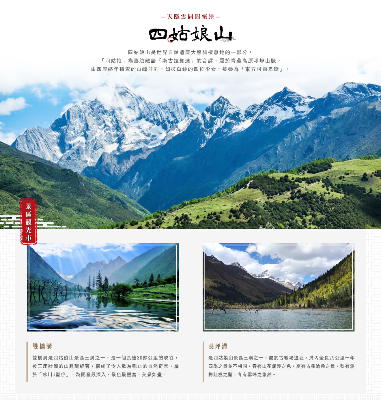 【四姑娘山】屬於世界文化遺產大熊貓棲息地的一部份,而「四姑娘」這個漢語名稱的來源,即是嘉絨藏語名稱「斯古拉如達(意為保駕山神)」的漢語音譯。屬青藏高原邛崍山脈,由四座連綿不斷的山峰組成,從北到南一字排開,山峰長年冰雪覆蓋,猶如頭披白紗的四位少女,主要景點由雙橋溝、長坪溝、海子溝、么姑娘山(么妹峰)、三姑娘山、二姑娘山、大姑娘山組成,擁有「東方阿爾卑斯」的美名,不僅是登山和探險的勝地,還因其豐富的自然資源和生物多樣性而被譽為世界上高山植被區系最豐富的地區之一,並且被列為世界自然遺產的一部份。