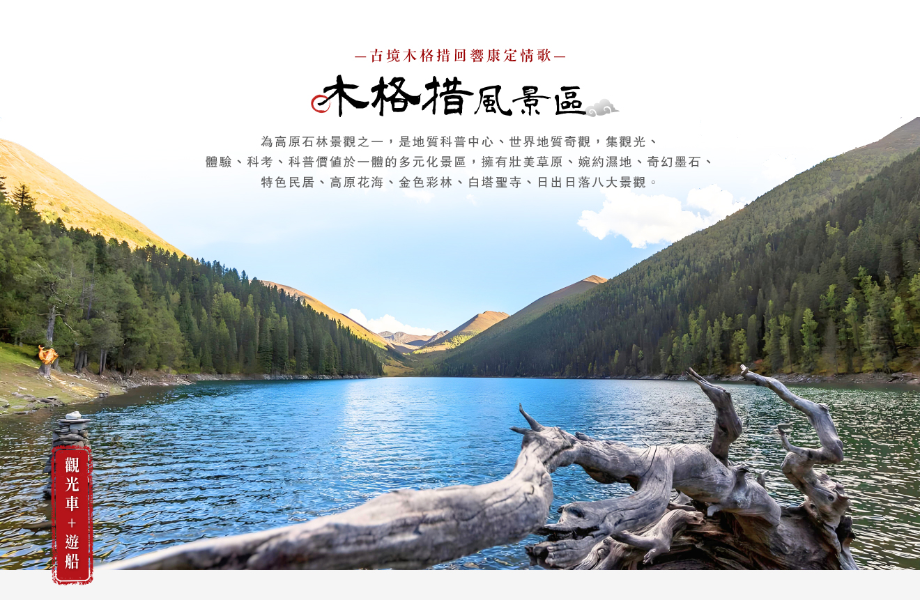 【康定情歌(木格措)風景區】跑馬溜淄的山上,一朵溜溜的雲喲、、、藏族歌曲康定情歌的發源地,又名康定情歌風景區,景區由七色海、杜鵑峽、藥池沸泉、木格措海等景點組成,以高山湖泊、原始森林、溫泉、雪峰、奇山異石及綿延不絕的疊瀑景觀,構成了秀麗風情;木格措漢名野人海,又名大海子,是川西最大的高山湖泊之一,附近有其他多個高山湖泊和溫泉,原始森林、草原和雪山景觀互相交融。