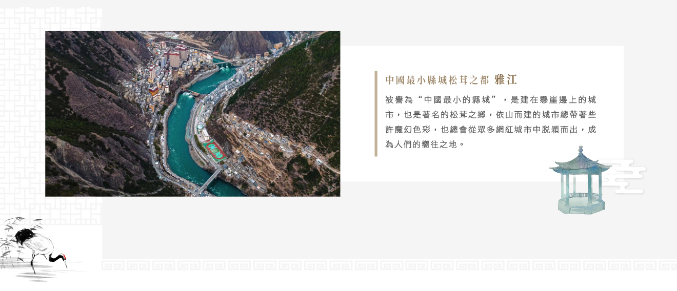 【雅江縣】除了是國道318必經之地,還擁有許多特別之處,它被譽為“中國最小的縣城”,是建在懸崖邊上的城市,也是著名的松茸之鄉,依山而建的城市總帶著些許魔幻色彩,也總會從眾多網紅城市中脫穎而出,成為人們的嚮往之地。