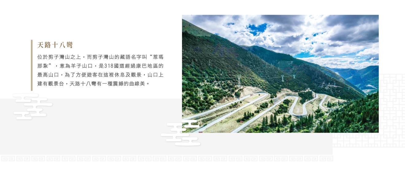 【天路十八彎觀景台】海拔約4000~4660公尺,位於剪子灣山之上,而剪子灣山的藏語名字叫“惹瑪那紮”,意為羊子山口,海拔約4659公尺,也是318國道經過康巴地區的最高山口,為了方便遊客在這裡休息及觀景,山口上建有觀景台,天路十八彎有一種震撼的曲線美,蜿蜒的山路如同一條巨龍一樣盤旋在山間,讓人產生一種千山萬壑盡收眼底的意境。