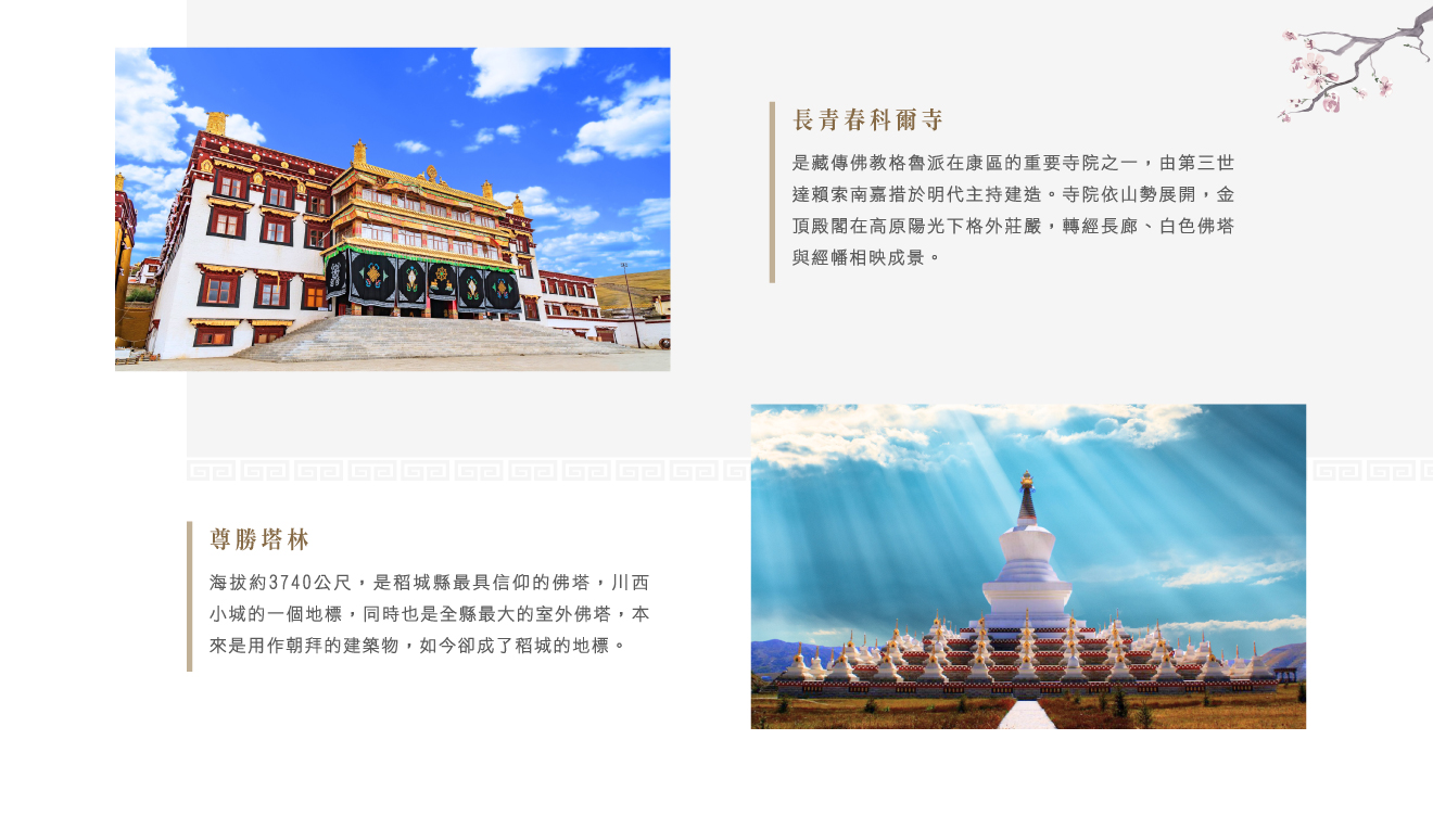 【長青春科爾寺(電瓶車)】又稱:理塘寺。藏傳佛教有俗語稱:上有拉薩三大寺,下有安多塔爾寺,中有理塘長青春科爾寺。可見其地位。