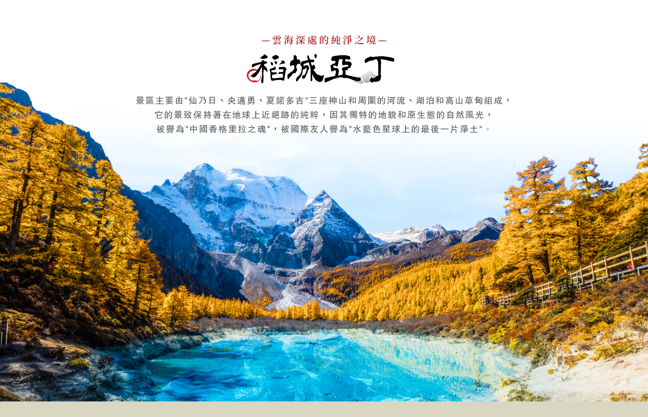 【稻城亞丁景區】海拔約2900~4180公尺,景區主要由"仙乃日、央邁勇、夏諾多吉"三座神山和周圍的河流、湖泊和高山草甸組成,它的景致保持著在地球上近絕跡的純粹,因其獨特的地貌和原生態的自然風光,被譽為"中國香格里拉之魂",被國際友人譽為"水藍色星球上的最後一片淨土",是攝影愛好者的天堂。