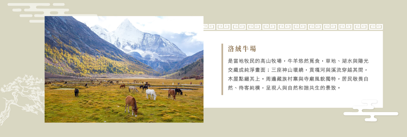 【洛絨牛場】洛絨牛場海拔4150公尺,是附近村民放牧的高山牧場,成群的牛羊在這裡享受著充足的陽光、青青的草地和純淨的湖水。洛絨牛場被三座神山環繞,貢嘎河穿過草場,溪流潺潺,與牧場木屋交相輝映,構成了原始迷人的景色。附近的藏鄉村寨和寺廟建築風貌獨特,人們崇拜自然,和諧相處。他們純樸友善,善待客人。這裡,人與自然融為一體。
