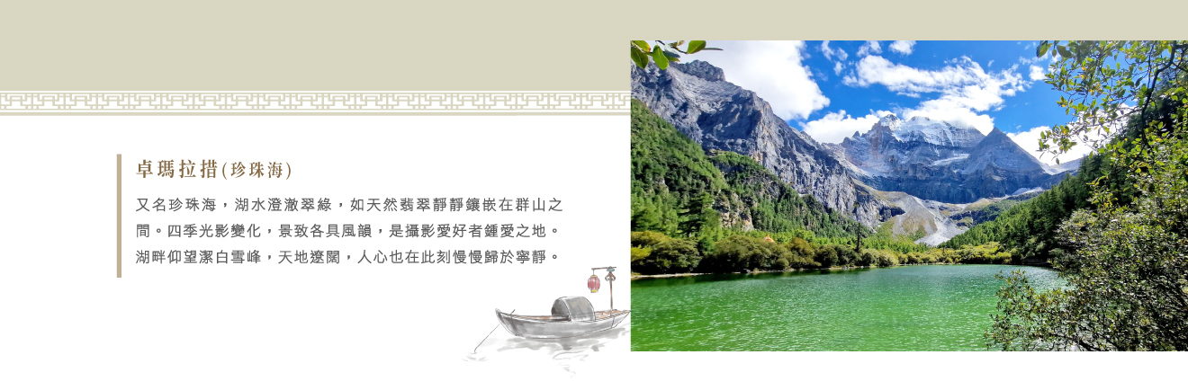 【卓瑪拉措】海拔約4100公尺,卓瑪拉措又叫珍珠海,這一泓翠綠的湖水,就像一塊大自然精雕細琢的天然翡翠,靜靜地鑲嵌於天地之間,季節十分不同景致更是別有一番韻味,絕對是攝影愛好者的不二選擇,面對高聳入雲的潔白雪山,在純淨如玉的卓瑪拉措湖畔,會感慨人之渺小,天地之大,在這一刻心會漸漸歸於寧靜。