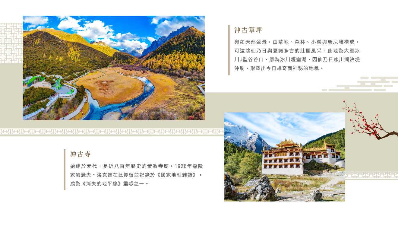 【冲古寺】海拔約3880公尺的仙乃日神山腳下,是一座具有重要文化旅遊價值的寺廟,建於元朝,屬於黃教寺廟,已有近800年的歷史,不僅因其獨特的地理位置和豐富的歷史文化背景吸引了眾多遊客,還因1928年美國探險家約瑟夫·洛克曾在此居住並給予了它極高的評價而聞名,洛克將他在沖古寺的所見所聞所感記錄下來,並在《國家地理雜誌》上發表,為希爾頓創作《消失的地平線》提供了靈感,使得沖古寺成為了探尋隱藏的世界~香格里拉的原型地之一。此外,沖古寺還是觀賞仙乃日、央邁勇、夏諾多吉三座神山的最佳地點,被譽為觀賞三座神山的必經之地