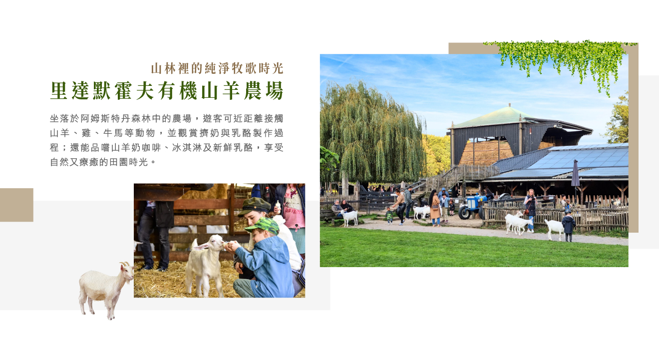 ★里達默霍夫有機山羊農場(每週二休館),坐落在阿姆斯特丹森林的中心,在農場裡遊客可以近距離接觸山羊、羔羊、雞、豬、牛和馬,這裡不僅風景優美,有機會可以親眼目睹農夫餵牲畜、擠羊奶、製作奶酪,或者在田裡收割乾草;也可以自行購買品嚐一杯山羊奶咖啡或卡布奇諾,或者老少咸宜美味的山羊奶冰淇淋,農場商店裡有各種美味的山羊奶酪,,均由乳酪工坊採用新鮮山羊奶製成。