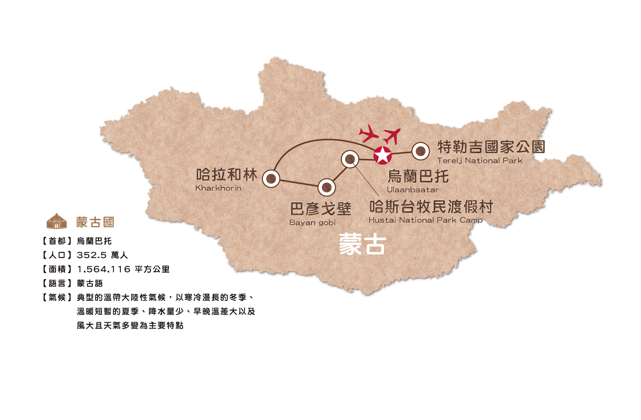 (2)行程會因實際操作後,回覆的旅館日期,而調整行程順序,表列蒙古包如遇訂滿,將更改 住宿地點,以同等級附獨立衛浴之蒙古包為替代。