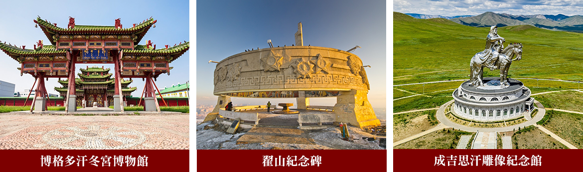 【成吉思汗雕像紀念館】坐落在小山丘上,於2008年建造,雕像高達40公尺,重達二百五十噸,全身由不鏽鋼澆灌,也是目前為止世界上最大的成吉思汗騎馬造型的雕像,是傳說中成吉思汗發現黃金馬鞭的地方,可以登到馬頭上覽景,並遠眺流經烏蘭巴托的土拉河,內部基座為博物館,展示匈奴時期至蒙古帝國的文物、兵器、服飾,地下層有世界最大靴子展示。