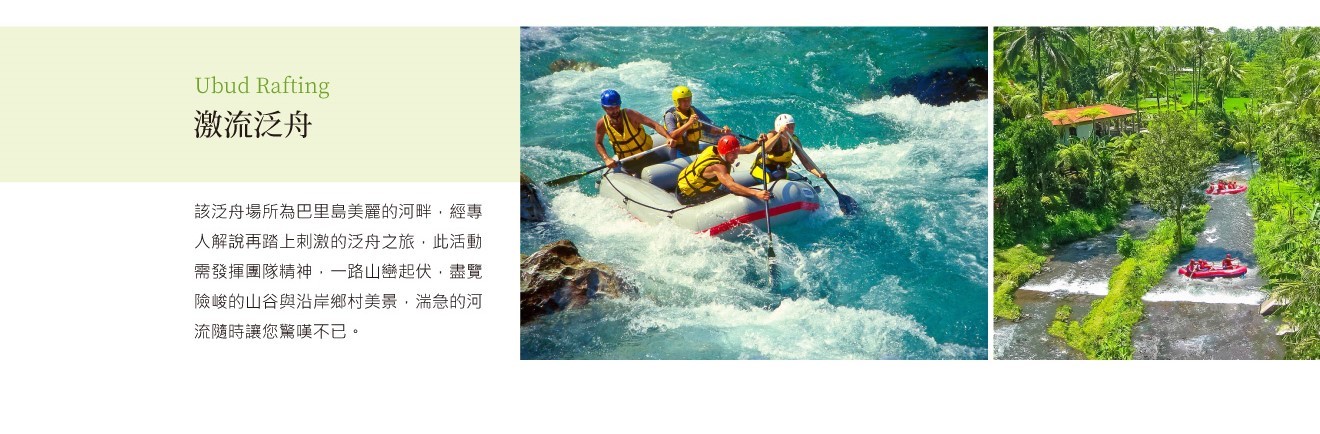 A行程: 河谷景觀俱樂部:激流泛舟+網美打卡熱點~高空鞦韆+鳥巢-IG熱門打卡景點~塔曼•薩拉斯瓦蒂蓮花水宮+享用STARBUCKS咖啡或飲料一杯) 今日,前往河谷景觀俱樂部~體驗驚險刺激的【激流泛舟】,激發您潛藏在內心的勇敢、活力與騎士精神。有別於台灣泛舟有季節限制,來到峇里島,全年四季都可以享受乘風破浪的趣味,激流、險灘、山谷、阻石,享受征服快感,緊握划槳,想像它是您專屬的『光輪兩千』,加速,飛躍。您亦可在山中化身美麗精靈,以綠色山林、藍色天空做背景,在【高空鞦韆】或【鳥巢】拍下美麗的身影。(坐鞦韆及拍照均需排隊,請耐心等候,並請注意自身安全,如有高血壓、心臟病等疾病或是當天有身體不適,或懷孕等情況,請不要勉強參加活動,以維護自身安全。鞦韆安全年齡限制為6-70歲,體重不得超過100公斤)。烏布Ig熱門打卡景點【塔曼·薩拉斯瓦蒂蓮花水宮】絕對值得妳的親訪,請準備好相機,在水宮前拍攝甜蜜指數破表的牽手背影照,打造專屬您倆的浪漫...。沿途中貼心安排任選一杯【Starbucks咖啡或飲料】來享用,烏布這間星巴克,因地處烏布藝術聖地,是水宮門口一座古色古香的建築,濃厚的峇里文化氣息,原始又古樸的風格充滿神秘感,讓人一進去便捨不得離開。