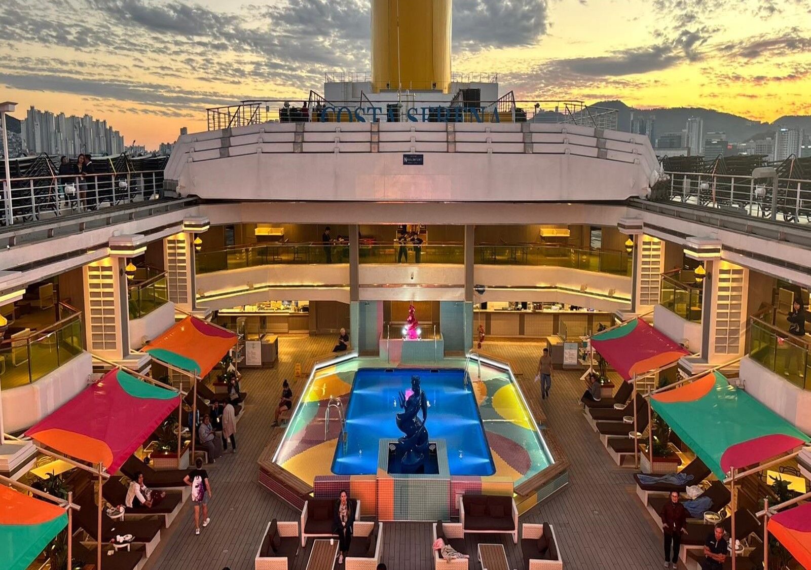 宙斯為眾神之王,掌管著天地萬物。歌詩達郵輪 莎倫娜號上隨處可見宙斯的雕塑和人像。宙斯大劇院位於 3-5 層甲板船頭,設計靈感來自於羅馬競技場,挑高3層甲板的環型座位,從任何角度都能欣賞主舞台的表演。