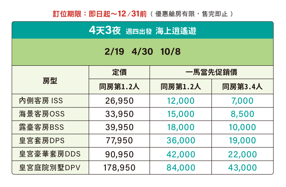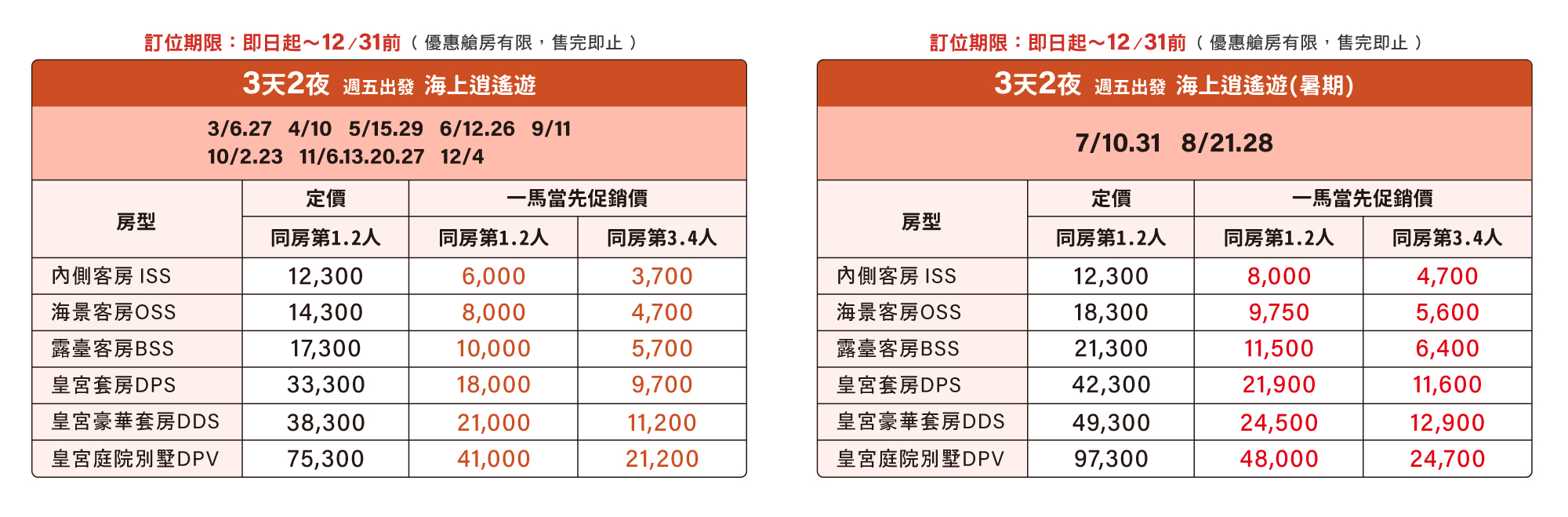 👉航程試算 航程價目表 (請點我) 線上旅展價目表(請點我) 詳細行程 岸上觀光 🔗 加入 LINE@ 享甜甜價 | |||